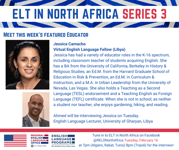 Join me Tuesday morning, February 16th, at 10 a.m. PST on the Regional English Language Office (RELO) North Africa Facebook page–normally I present or interview, this time I am the interviewee!